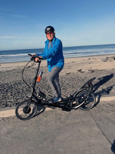 Soon after moving to Solana Beach, Jane spotted a rider cruising on an ElliptiGO bike and waved him down. That rider happened to be Brent Teal, ElliptiGO’s co-founder. Before Scott knew it, Jane had rented him an ElliptiGO bike for the weekend.